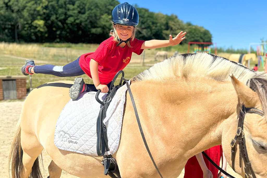Reitangebote – Pferdezeit mit Herz: Ob Reiterferien, liebevoller Reitunterricht oder besondere Kindergeburtstage – auf dem Landgut stehen das Miteinander von Menschen und Pferd im Mittelpunkt. In kleinen Gruppen erleben Kinder eine außergewöhnliche Pferdezeit, geprägt von Achtsamkeit, Freude und respektvollem Umgang. Die Pferde sind treue Begleiter bei Hofabenteuern und Teil der tiergestützten BNE.